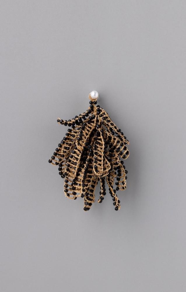 編み目の透け感と、幾重にも折り重なるプレートが豊かな表情を生み出します。